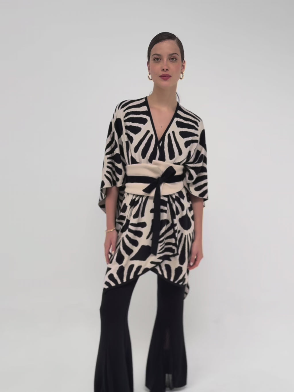 Una prenda muy versátil que combina diseño, funcionalidad y sofisticación. Este chal doble faz está confeccionado en tejido de punto con patrones geométricos en negro y beige, pensado para transformarse según la ocasión.