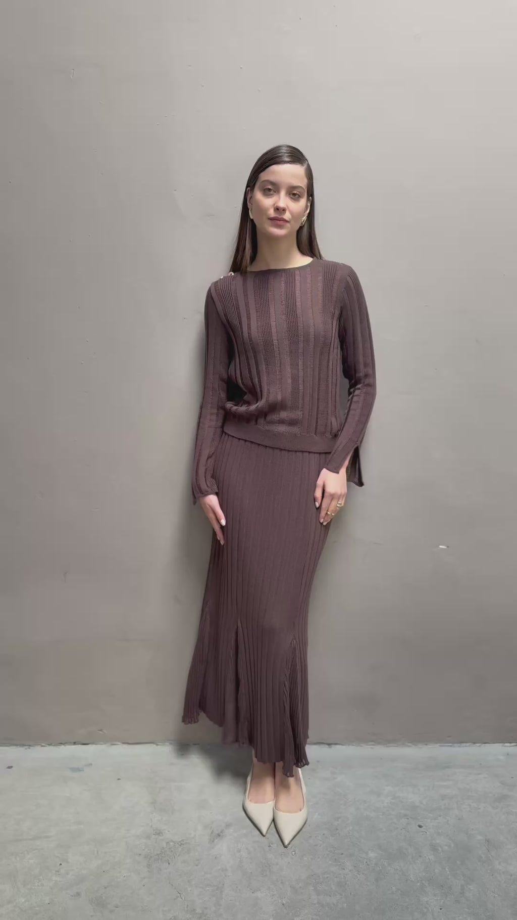Una prenda versátil y elegante que realza la silueta con movimiento y sofisticación. Confeccionada en tejido de punto acanalado, esta falda se ajusta suavemente en la cadera y se amplía hacia el bajo con un efecto sutilmente acampanado.